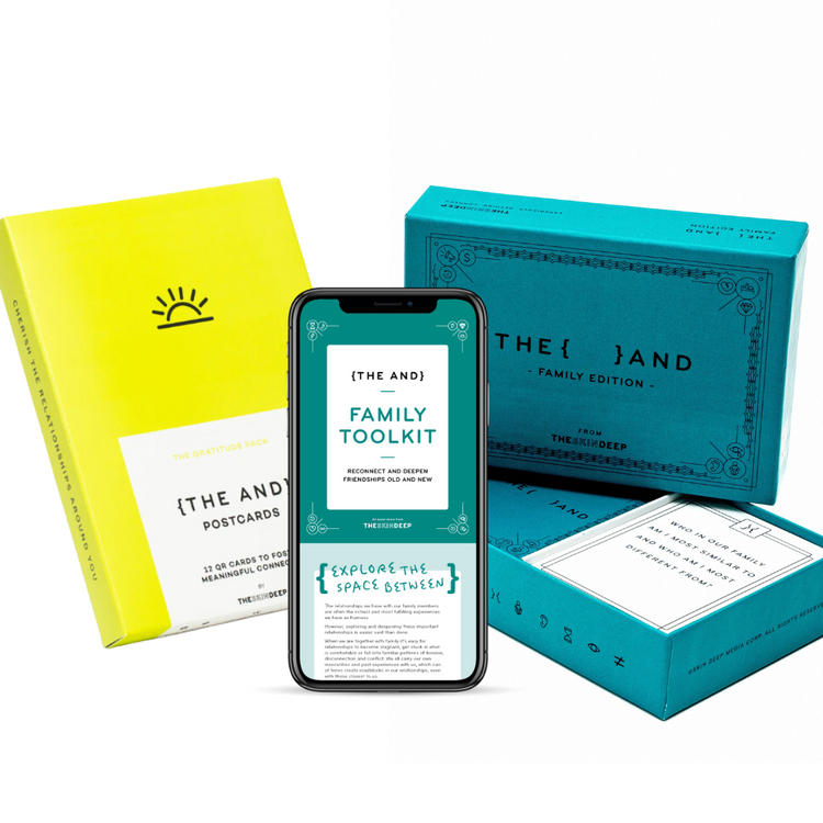 Experience the ultimate bundle from The Skin Deep for meaningful family connection! Discover new conversations with your entire family while building new bonds that will last a lifetime with the Ultimate Family Bundle. This popular bundle includes our incredibly popular {THE AND} Family Edition card deck, our unique Gratitude Postcards, and our brand new Family Toolkit. Whether you're looking to strengthen family ties, reconnect after time apart, or start experiencing {THE AND} right now around the dinner table, this is the perfect bundle for the family looking to connect.
