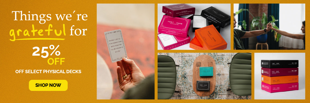 I love the variety and scope, there's something for everyone — and even a few blank cards so you can add your own ideas. The directions let you pass if you’re not comfortable answering, which makes it stress-free and inviting for everyone. If you are like us, some questions will have you doubled over laughing (like “what experience have we shared that was awful at the time but hilarious now”), while others will spark conversations that help you learn things about each other that help you relate and bond.